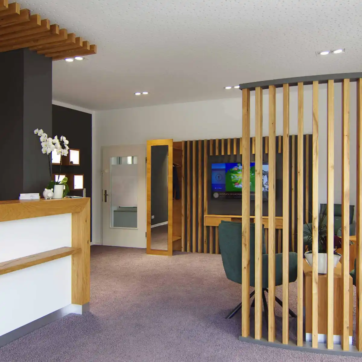 - Empfangsbereich: maßgefertigte Theke mit integrierter Beleuchtung für eine freundliche Begrüßung